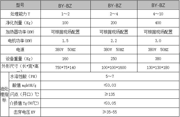 三、BY-BZ系列变压器油吸附再生装置技术参数表: