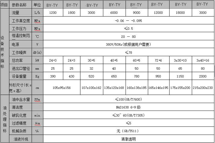 四、BY-TY系列透平油专用真空滤油机技术参数表: