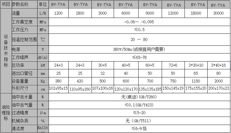 四、BY-TYA系列液压油真空润滑油滤油机技术参数表: