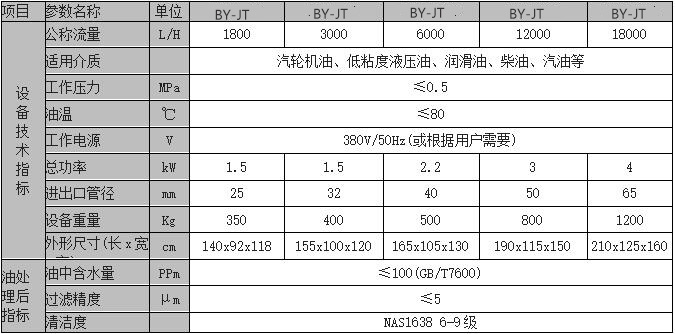 四、BY-JT系列聚结分离式净油机技术参数表: